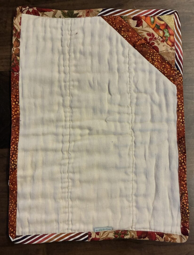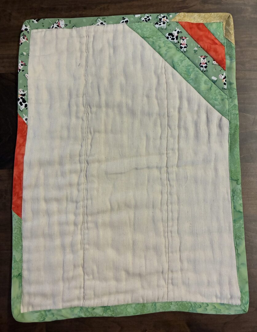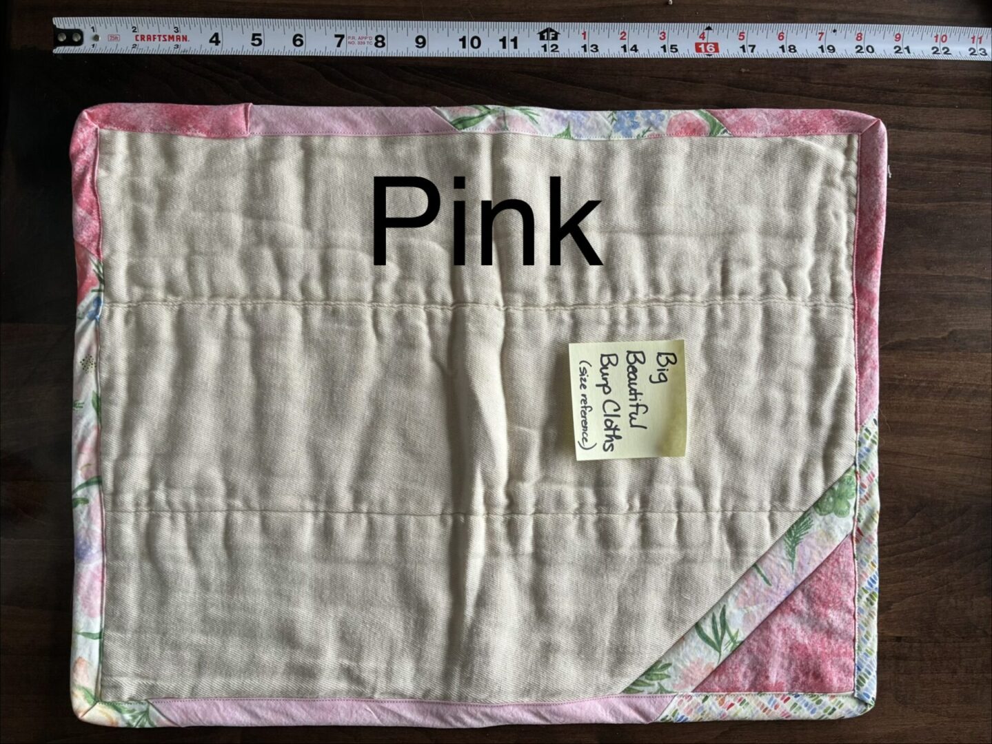 These burp cloths are made from brand-new toddler-size cloth diapers (the biggest cloth diapers made). Each one can hold 2 cups of liquid minimum, and will wash beautifully around 15 dozen times. Beautifully edged in quilting fabrics, these are so large that your entire should and part of your back are protected – no more needing to aim the baby! Contact us by phone/text for photos of the current inventory (no two cloths are ever quite the same, and color selection is always refreshing itself). 563-920-5427
